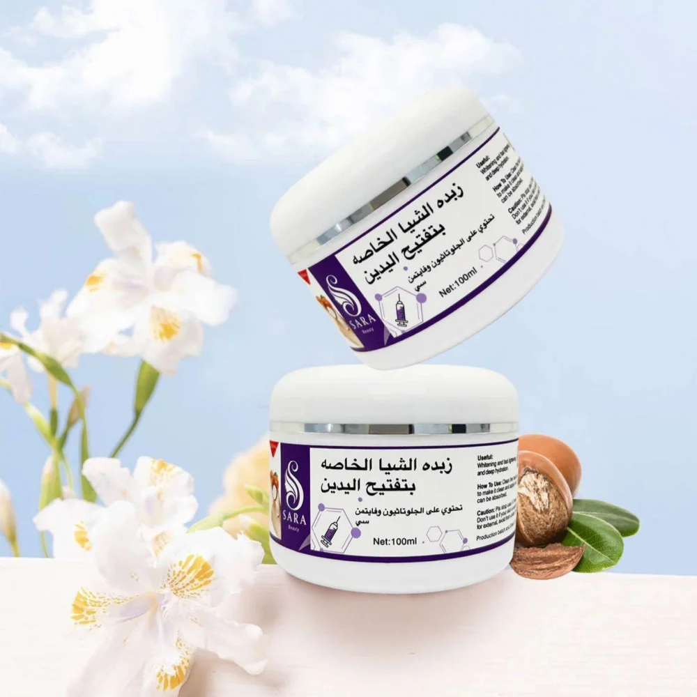 لا تدعي جمال يديك يتوارى خلف آثار الزمن والإرهاق. امنحيهما لمسة من العناية والتألق مع زبدة الشيا بالجلوتاثيون من "سارة بيوتي". اغتنمي الفرصة الآن لتجربة هذا المنتج الثوري واستعيدي نضارة وشباب يديك في لحظات. اشتري اليوم وابدئي رحلتك نحو بشرة أكثر إشراقًا ويدين أكثر نعومة!